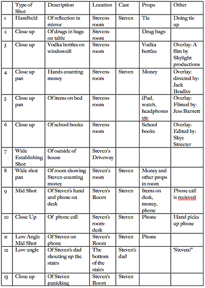 We made a shot list, this would allow us to plan our shots in advance meaning the filming process would be a lot more efficient. This is not a set document, as the process goes on we will make changes and can adapt it depending on if our ideas change.